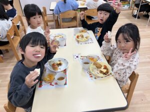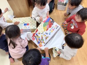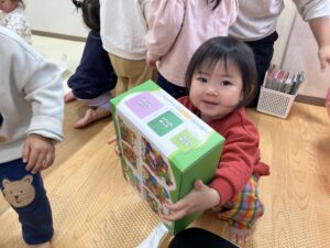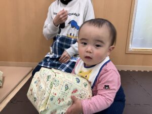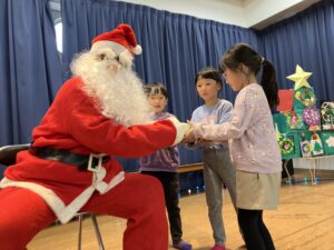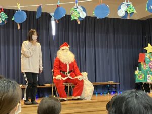 12月24日(水)にお楽しみ会がありました。みんなで歌をうたったり、保育士たちが演奏する楽器の音色に合わせて手拍子をしたりと楽しんで会に参加していた子どもたち。「サンタさん来てくれるかなぁ…」と待っていると鈴の音が聞こえ、プレゼントを持って、やってきてくれたサンタさんに大喜びのこどもたち。一緒に写真を撮ったり、質問したり、プレゼントを貰ったりと素敵な時間を過ごすことができました。