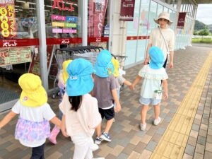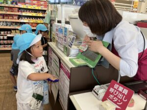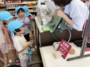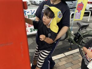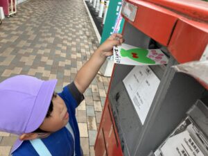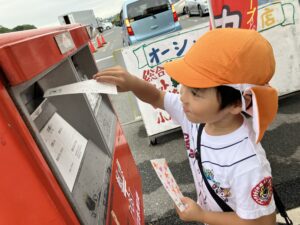年長組は近くのマックスバリュー石内店まで葉書を購入しに行き、緊張しながらも自分で代金を渡して、葉書とレシートを受け取っていましたよ。