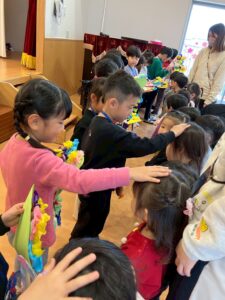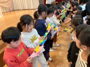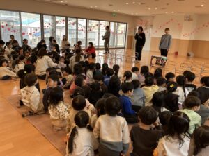 3/9(月)ゆり組さんとのお別れ会がありました。みんなが見守る中ゆり組さんが入場。ピシっとしていて年下の子どもたちは目をキラキラさせ憧れのまなざしで拍手をしていましたよ!優しくてかっこいいゆり組さん。たくさんあそんでもらってみんなゆりぐみさんが大好きです!!小学校へ行っても頑張ってね!!