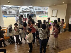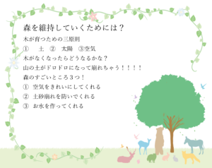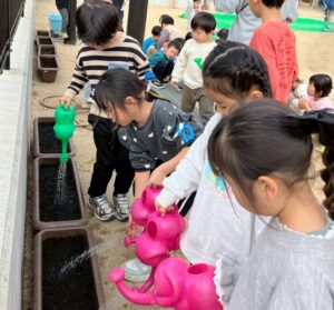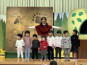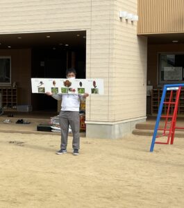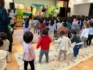 12/11(木)「森はみんなのともだち、森を守り育み、未来へつなげよう!」プロジェクトということで、森の教室がありました!どんぐりくん、ふぁみたんが来てくれて森を作っていくために必要なものや森の役割について教えてくれました。また、一緒にダンスを踊ったりと楽しく学ぶことができました!その後、幼児組はどんぐりを植え、「どんぐりを大切に育てます!」宣言をしました!