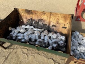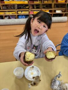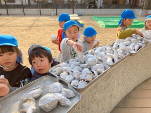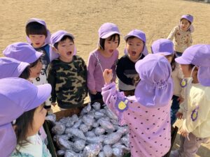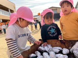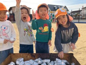 12/10(水)焼き芋会がありました。ひまわりさかえこども園で育てたさつまいもをアルミホイルで巻きドラム缶に投入!!「おいしくなぁれ!!!」とおまじないの声がどんどんと大きく!いい匂いがしてくると「早く食べたいな!」と出来上がりを待ちわびていました。ほくほくのお芋を食べることができてとっても嬉しそうでした!!