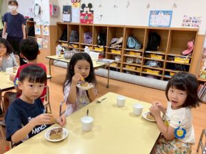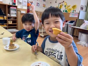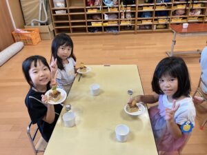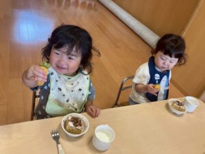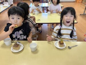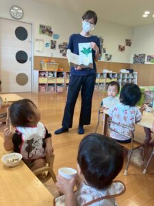 9/8(月)絵本【やさいさん】のにんじんがおやつに登場!!にんじんが抜けると「わぁ~♡」と目をキラキラ!!喜びながら口いっぱい頬張っていましたよ!!