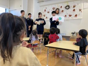 中学生が一人ひとり制作した絵本の読み聞かせ、また子どもたちが喜びそうな遊びを考え、工夫して持ってきてくれていました。