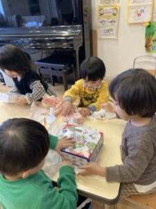 12月24日、おたのしみかいがありました。「あとなんかいねたらサンタさんくる?」と楽しみにしていた