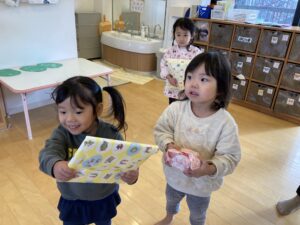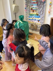 12月24日(火)におたのしみかいがありました。朝から「サンタさん!サンタさん!」と大喜びの子どもたち。みんなで“あわてんぼうのサンタクロース”を歌ったりパネルシアターを楽しんでいると…窓の外にサンタさんが!!今年も大きな袋と一緒にたくさんのプレゼントを用意してくれました。どきどきしながらプレゼントを開けると夢中になって楽しむ子どもたちでした。「サンタさんありがとう!」