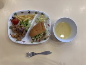 ・ハンバーガー  ・ポテト  ・コールスロー  ・ブロッコリー、トマト  ・からあげ